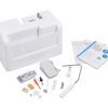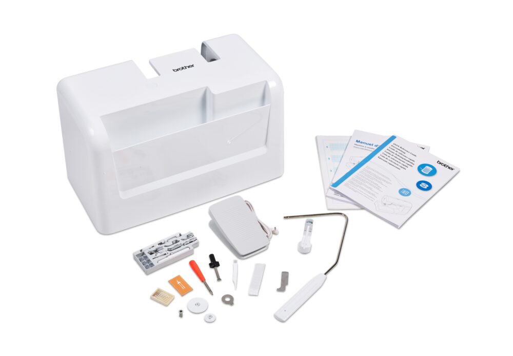 Boite d'accessoires contenant : pied standard, pied pour ourlet invisible, pied pour pose de fermeture à glissière, pied pour boutonnière, pied surjet, pied pour la pose de boutons, pied pour points décoratifs, 4 canettes, 1 découd-vit, assortiment d'aiguilles, porte bobine supplémentaire.