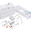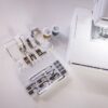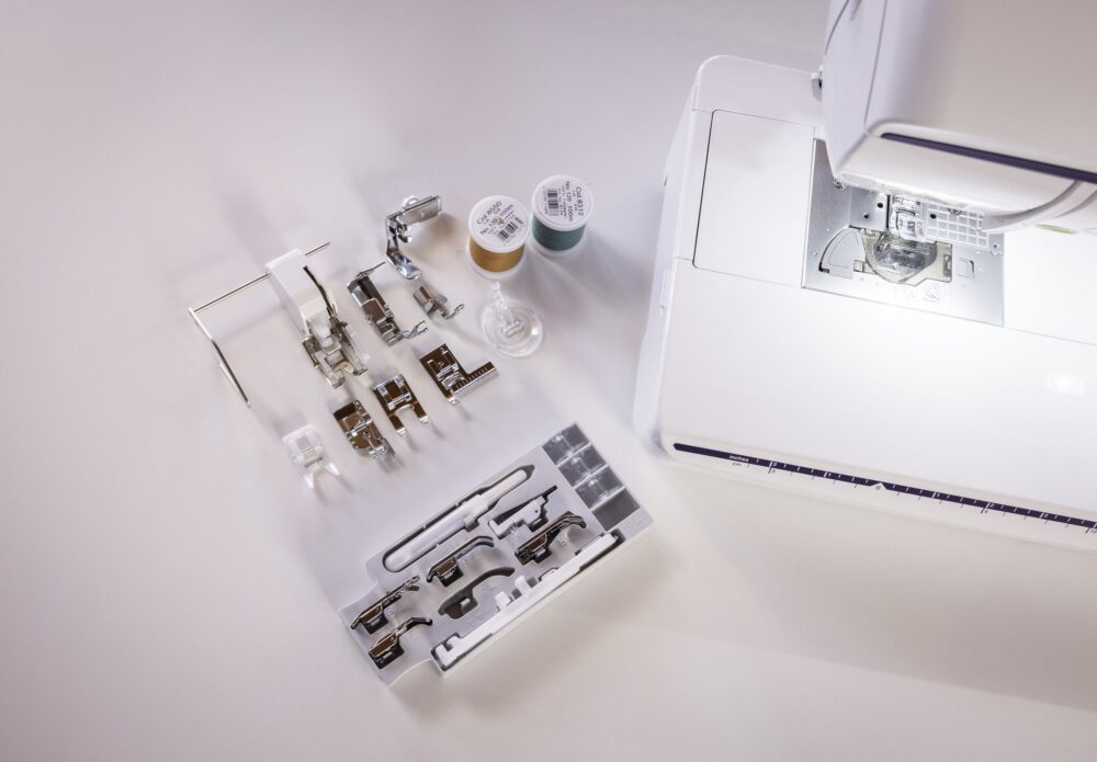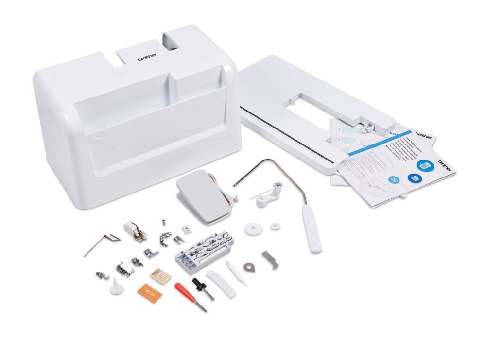 Boite d'accessoires contenant : pied standard, pied pour ourlet invisible, pied pour pose de fermeture à glissière, pied pour boutonnière, pied surjet, pied pour la pose de boutons, pied pour points décoratifs, pied pour quilting ouvert en mouvement libre, pied pour quilting en écho en mouvement libre, pied pour quilting en mouvement libre, pied double entraînement, pied pour quilting 1/4"" (avec guide), guide pour quilting, pied guide de couture, pied réglable pour fermeture à glissière/ passepoil, pied anti-adhérent, pied ouvert, 4 canettes, 1 découd-vit, assortiment d'aiguilles, porte bobine supplémentaire.