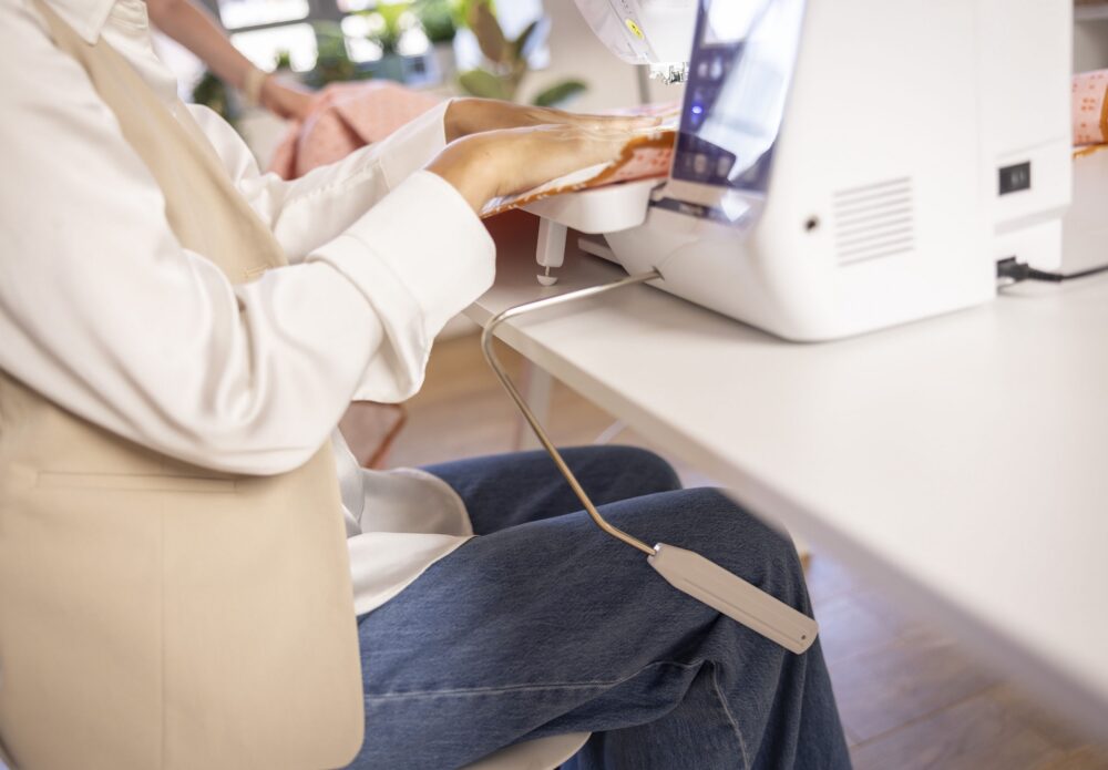 - Genouillère : Gardez les mains libres pour guider votre tissu en toute fluidité. Relevez ou abaissez le pied-de-biche d'un simple mouvement du genou, une fonction indispensable pour le patchwork et le quilting.